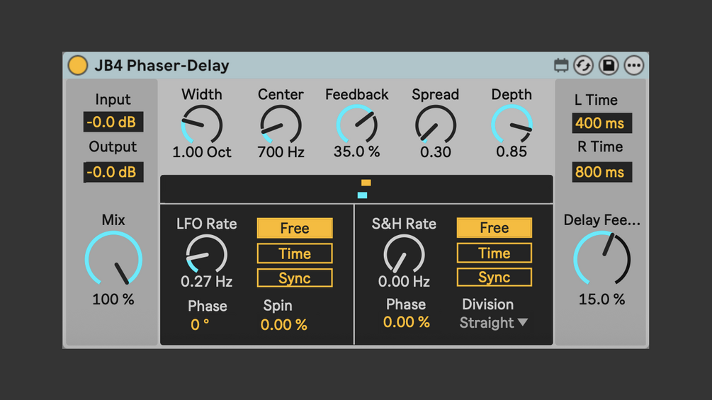 JB4 Phaser-Delay is an emulation of the famous Ensoniq DP/4 phaser-delay, built in Max and Gen~ and fully compatible with Push 3 Standalone.
